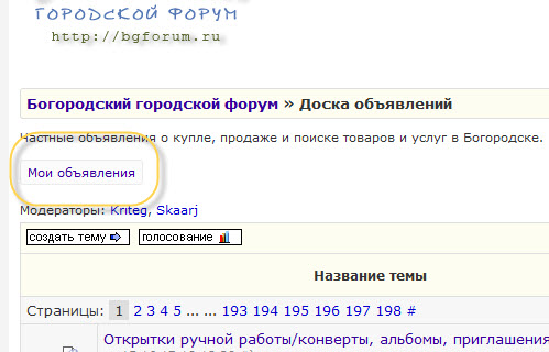 | Удобно. Только сообщение "Частные объявления о купле, продаже и поиске товаров и услуг в Богородске. Чтобы разместить объявление, нужно зарегистрироваться или войти на форум под своим именем." отображается и для зарегистрированных пользователей.
