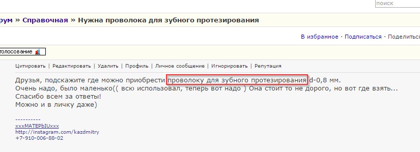 little bastard, я повторю еще раз — заголовок объявления меняется за тем, чтобы другие посетители сразу по заголовку могли понять о чем идет речь внутри сообщения. Вы хотя бы за свои слова отвечайте. Сначала пишите, что вам нужна проволока для зубного протезирования, а потом утверждаете, что это просто проволока. Я ничего нового в заголовке не написал и не выдумал, я взял и скопипастил ваше сообщение, причем сохранив контекст. Ищите проблемы в себе, формулируйте свои мысли корректно и понятно для всех, а не только для вас. Не нужно винить меня в том, что вы не можете четко обозначить ваши потребности. Да и вообще, есть авито, из-рук-в-руки, богородская газета. Размещайте там свое объявление с какими угодно заголовками по вашим правилам и доказывайте как хотите свою правоту. Кнопка Выйти находится рядом с вашим ником в правом верхнем углу.