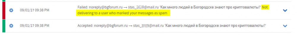stas777, мы отправляем почту через внешний почтовый сервис. Логов он не предоставляет. Я не понимаю в чем вы хотите разобраться. Я уже сказал причину. Нам нельзя отправлять пользователю, который однажды отправил нашу почту в Спам. Таковы правила. Единственный вариант решения проблемы — сменить электронный адрес в профиле. Отправить на текущий адрес почту нельзя. Никак. Вообще.