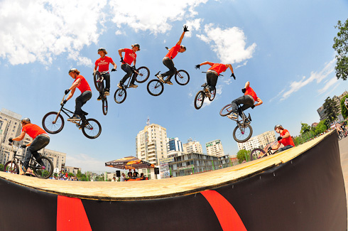 как с велосипедистом так это сделать не пробемма, есть у меня панорама на которой парень с девушкой присутствуют на ней 8 или более раз, а вот со шлейфом если, то труднее- тут нужно подходящее освещение чтобы оставася шлейф, и еще что то- вроде вспышки или даже вспышка для фиксирования различимых образов. Сдеать такое реально, но сложно ----------