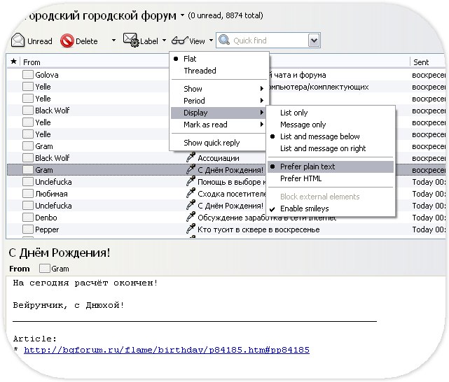 | На майл ещё заглянуть надо. У меня , например, этих майлов штук 20. Надо в профиль заходить, смотреть, какой ящик для БГ-форума. А я ещё ленивый чел, наверняка у активных интернетчиков ящиков впятеро больше.
