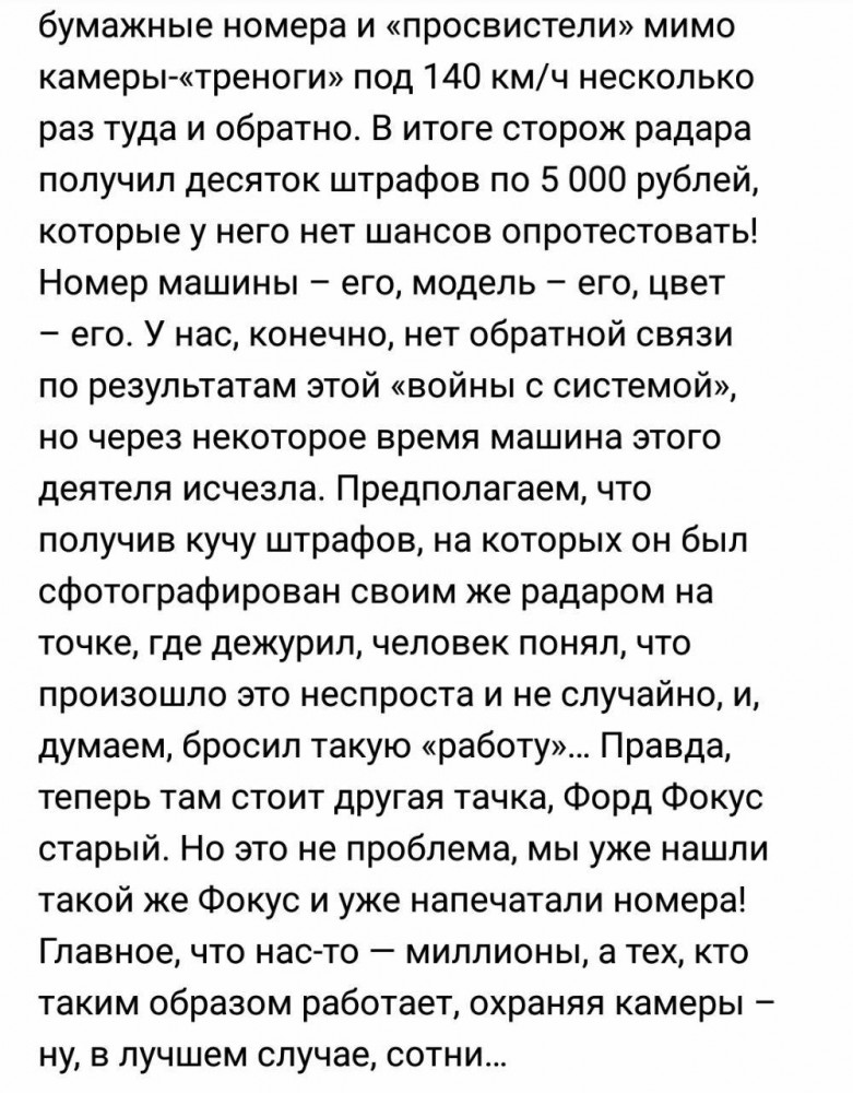 Цитата: Немного про мобильные камеры фиксации нарушений на дорогах Нижегородец рассказывает: «Давно не секрет, что на трассах устанавливают мобильные комплексы фиксации правонарушений. Однако с таким коварством столкнулся случайно и в первый раз. Трасса: Москва - Нижний Новгород. Кончается омывайка, ищу место для остановки. Увидел автобусную остановку, решил за ней паркануться. Знак по трассе 90, при подъезде к остановке 70. Естественно все прут в районе 100 и немного сбрасывают, населенных пунктов в округе нет. Ни одного знака о фиксации нет. Встал, залился и обернулся. Вроде ничего страшного, тачка остановилась. Может отлить, может очистителя залить. Но посмотрите внимательнее, оказывается стоит камера. Обратите внимание на установку, т.е. камера прикрыта автомобилем, совсем, и стреляет в зад. Много раз видел авто с камерами, но все всегда стояли прямо на трассе или за машиной, обычно знак фотофиксации висит.Такое коварство встретил впервые. На сколько это законно вообще, не ясно. Всем удачных дорог, может кому поможет». скрытый текст ![]() ![]() |