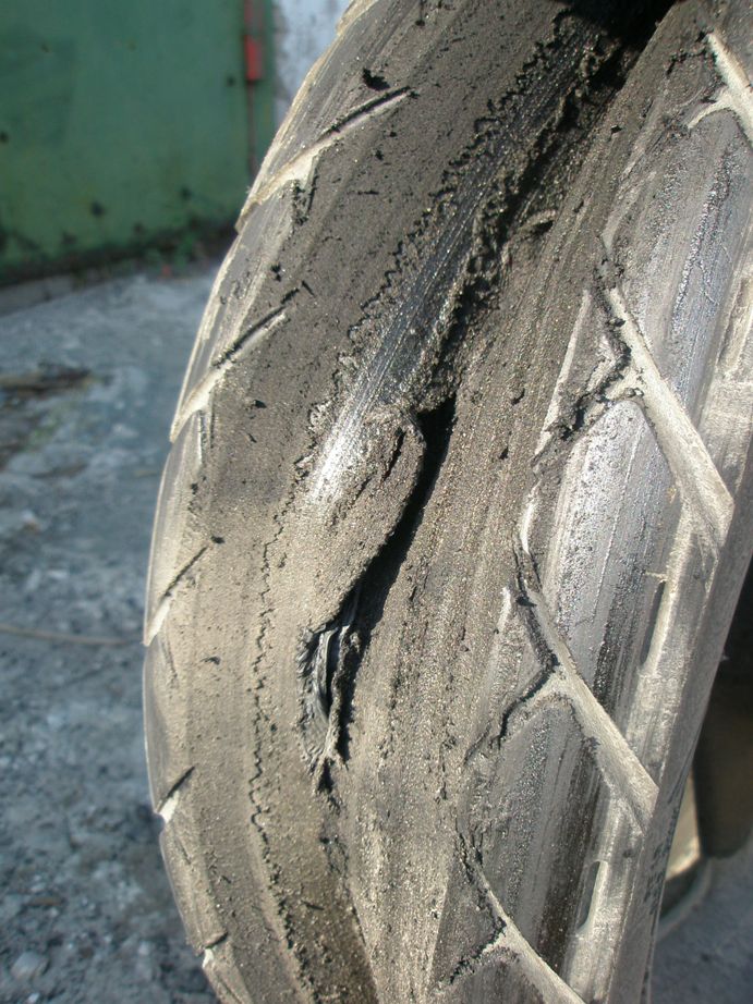 Как оказалось бетону пофигу...покрышла начала испускать потихоньку дух в виде ошметков резины |