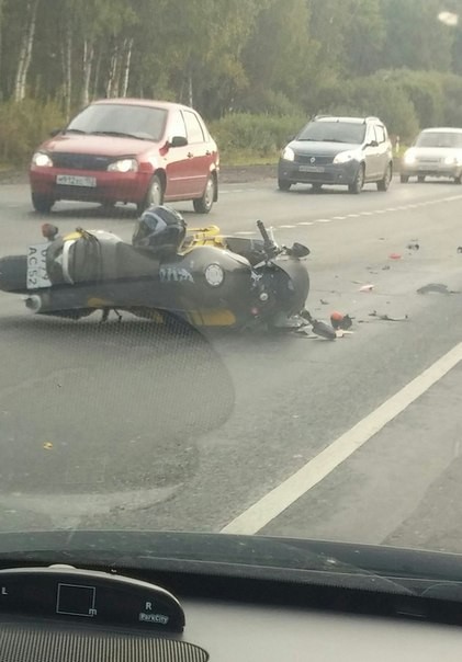 Я не совсем поняла где водитель мотоцикла. Потому что на проезжей части никто не стоял. Мотоцикл валялся,машина на обочине и никого