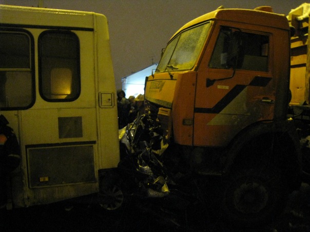 | Я проезжал мимо этого ужаса. Сначала издали показалось, что Камаз просто в автобус въехал, а подъехал поближе и увидел, что это не так. Хоть и неуместно было, но вспомнился анекдот про "тссс... она между нами". Камаз явно не положенные 40 там летел.