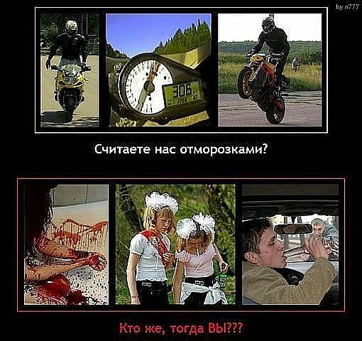 | AlexBG написал: Цитата:Цитата:Просьба ко всем мотомопедоциклистам- не гоняйте по разделительной между двумя полосами встречного движения, все спешат и всем неколи.Верно подмечено. А то бывает что водители даже не замечают мотопедистов. Если не ездить по разделительной и в междурядье, то зачем тогда вообще байк нужен.... ----------