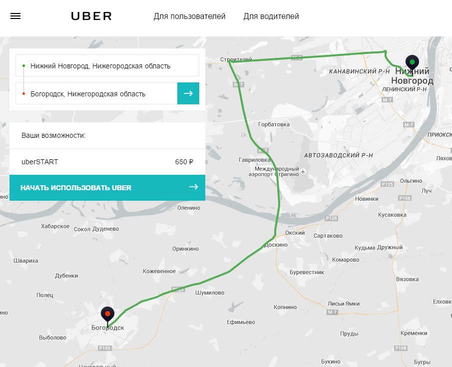 С сегодняшнего дня Uber теперь ездит и в область. К примеру, из любого места Нижнего Новгорода до любого места в Богородске поездка будет стоить 650 рублей.