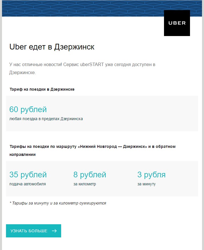 А если использовать промо-код ubernnov на первую поездку, то цена будет совсем низкая. Тарифы такие: