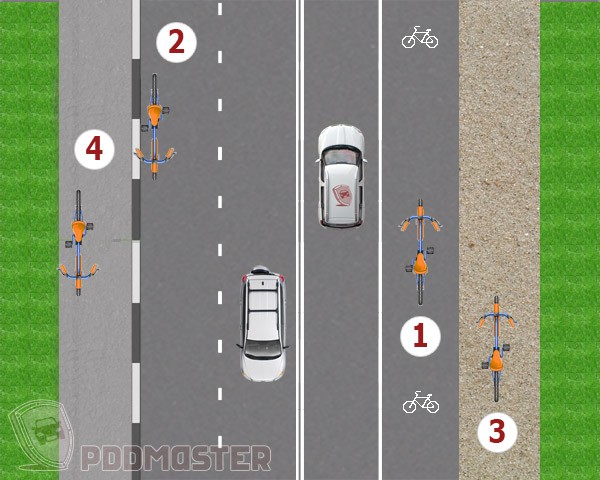 Движение велосипедистов старше 14 лет возможно в порядке убывания: 1. По велосипедной, велопешеходной дорожкам или полосе для велосипедистов. 2. По правому краю проезжей части. 3. По обочине. 4. По тротуару или пешеходной дорожке. Обратите внимание, что каждый последующий пункт в вышеприведенном списке подразумевает, что предыдущие пункты отсутствуют. |