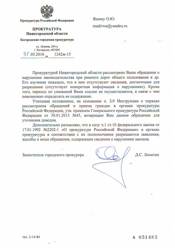 Отписка стандартная. Причём здесь частные дома ?!, если населённый пункт значит должны быть тротуары и проезжая часть согласно стандартов РФ. Пишем все в прокуратуру и незабываем копировать ссылку петиции !!! http://procnn.ru/ru/128/6/32/34/ Пример: Я, Яшин Олег Юрьевич, прошу Вас зарегистрировать петицию, ознакомиться с комментариями. А также провести прокурорскую проверку местного самоуправления города Богородска на факт бездействия в ремонте дорог и тротуаров и в их отсутствие. Дороги и тротуары в городе Богородске в ужасном состояние и не соответствуют стандартам РФ. Ссылка петиции, необходимо: скопировать ее, вставить в адресную строку браузера и перейти по этой ссылке. https://www.change.org/p/%D0%B...m=copylink ----------