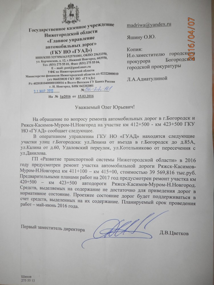Данная петиция будет направлена в Богородскую городскую прокуратуру, если данная прокуратура напишет отписку то будем вместе действовать дальше. Мы жители города Богородска и района просим главного прокурора города Богородска провести финансовую проверку местного самоуправления на факт бездействия и нерационального использования поступающих средств из разных бюджетов, для обустройства дорог, тротуаров и т.д. в соответствие стандартов РФ и при необходимости направить материалы в следственный комитет. Куда расходуются поступающие денежные средства?! Так как считаем, что поступающие денежные средства, в местный бюджет, не в полном объёме используются для восстановления дорог и тротуаров согласно стандартов РФ. Бездействия местного самоуправления города Богородска Нижегородской области — петиция на change.org ----------