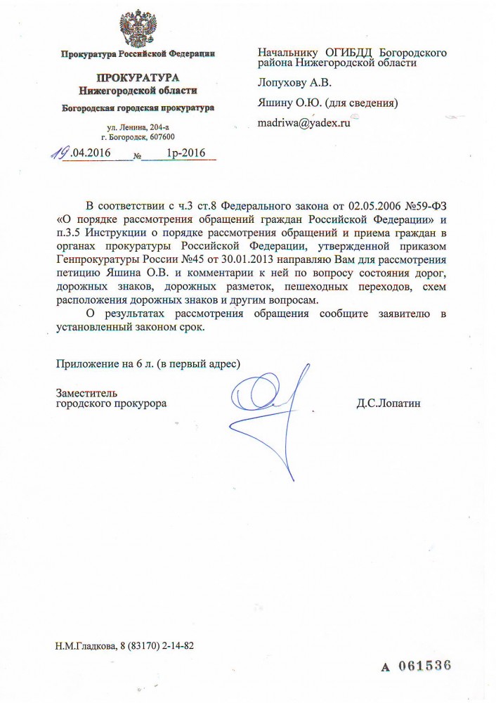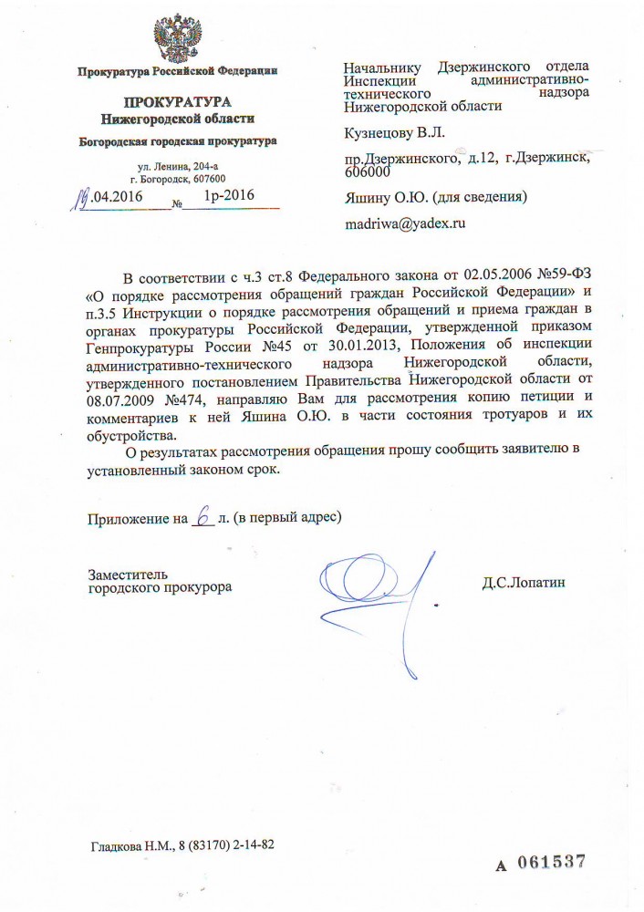 Моё обращение с петицией Прокуратура Нижегородской области направила в Богородскую городскую прокуратуру, чтобы получить ответ за подписью Ржевцева О.П.