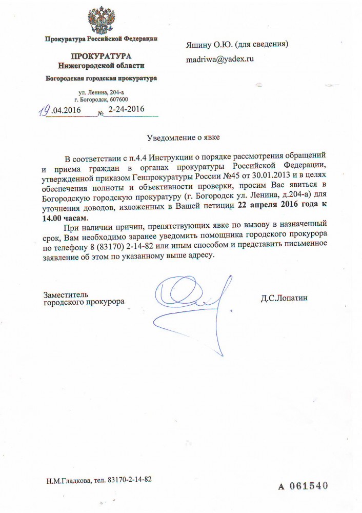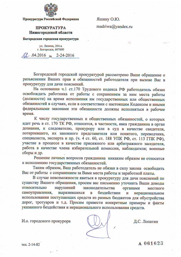Просят меня явиться в прокуратуру. Согласен, но пусть будет по закону РФ. Вот такой им ответ я направил - Я, Яшин Олег Юрьевич, сообщаю Вам на Ваше уведомление от 19.04.2016 года № 2-24-2016. Я, работаю в ......................................... Прошу Вас разъяснить мои права и обязанности согласно Трудового кодекса РФ. Также кто мне будет оплачивать моё отсутствие на рабочем месте согласно ТК РФ. Прошу Вас направить мне новое уведомление о явке, где мне будут разъяснены мои права и обязанности работодателя данной организации согласно ТК РФ.