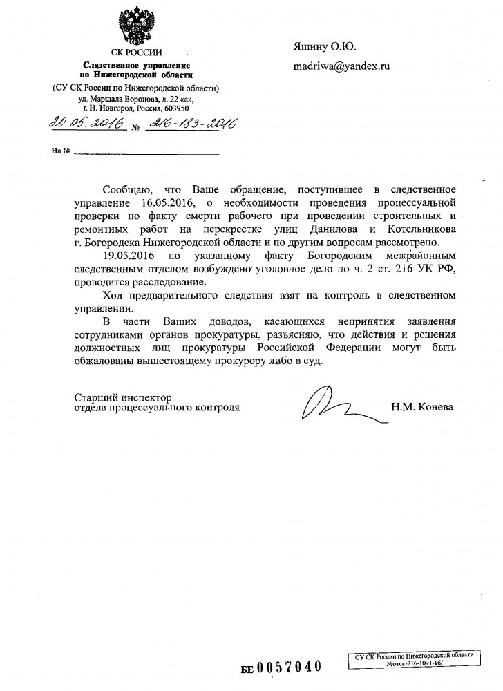 Хотели у нас в Богородске замять это ЧП, но не получилось !!! Ответ Следственного управления по Нижегородской области.