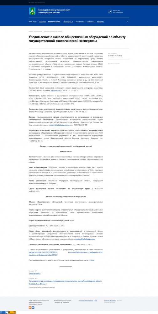 с темой «общественные обсуждения», а также на почтовый адрес администрации Богородского муниципального округа: 607600, Нижегородская область, г. Богородск, ул. Ленина, 206. Как можно больше до конца года. Нужна массовая огласка !!! Текст: На сайте Богородской администрации объявлено о проведении общественных обсуждений материалов ОВОС (оценки воздействия на окружающую среду) реконструкции полигона ТБО у д.Лазарево Богородского района в виде опроса. Принимая решение о такой форме общественного обсуждения объекта 1 категории опасности не учитывались возможности людей. И не только в прочтении более 1500 страниц трудного для понимания простого человека текста, но и тот факт, что многие просто не имеют возможности зайти на сайт. Зима выдалась очень проблемная. Люди зачастую думают не о сайте администрации, а когда появиться электричество, вода и тепло. Учитывая крайнюю важность понимания безопасности реконструкции и расширения полигона, люди должны до принятия решения о замечаниях или возражении получить достаточный аргументированный комментарий и анализ по материалам проекта от компетентных специалистов или заказчика проекта. Это можно сделать лишь на публичных обсуждениях, при полной информированности населения. Однако, кроме материалов выставленных на сайте соответствующая информация в средствах печати отсутствует. В Приложении к Приказу Госкомэкологии от 16.05.2000 г. №372 Положения об оценке воздействия намечаемой хозяйственной и иной деятельности на окружающую среду в Российской Федерации гл.4 «Информирование и участие общественности в процессе оценки воздействия на окружающую среду» указано, что «при принятии решения о форме проведения общественных обсуждений, в том числе общественных слушаний, необходимо руководствоваться степенью экологической опасности намечаемой хозяйственной деятельности, учитывать фактор неопределенности, степень заинтересованности общественности.» Эти обсуждения хотят провести тихо, незаметно для общественности. Мы, жители района не хотим быть подопытными кроликами, молча наблюдать за уничтожением экологии нашего района. У нас и так имеется много других негативных факторов, таких как вонь от сбросов в р.Рязанка. Требуем провести эти обсуждения публично, в очной форме и ответить нам на все наши вопросы! Разместить информацию об общественных слушаниях в Богородской газете. ----------