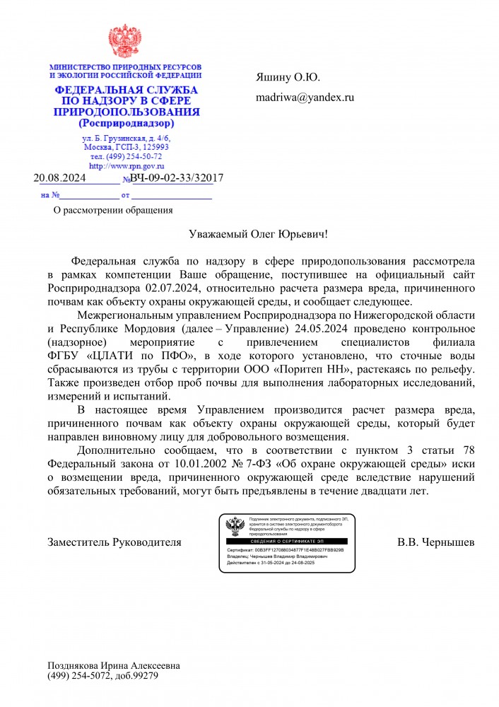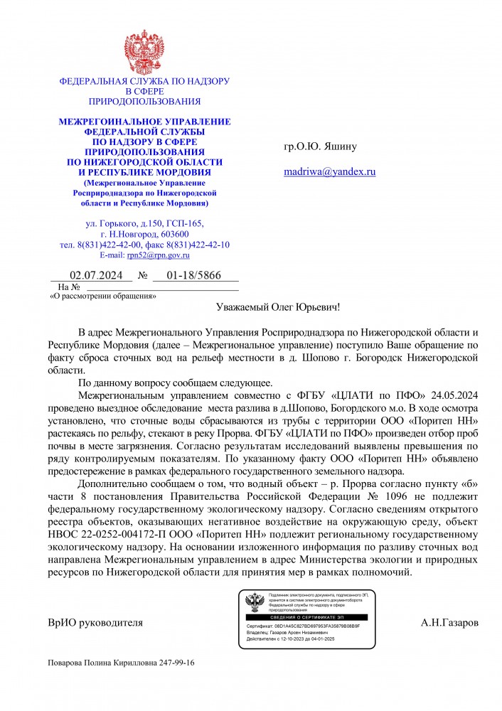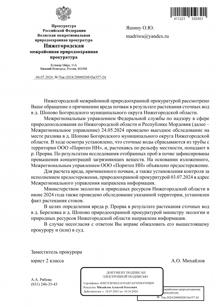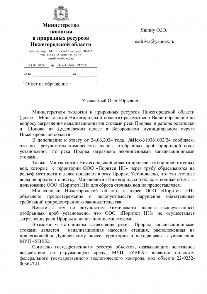 Добрый вечер всем. От куда только не происходит загрязнения водных объектов в Богородском муниципальном округе Нижегородской области. А все эти стоки попадают в р. Кудьма и далее в р. Волга. Интересный ответ Министерство экологии и природных ресурсов Нижегородской области. Но в данном ответе нет информации, что ущерб водному объекту р. Прорва будет рассчитан. Прошу принять прокурорские меры для расчёта ущерба, расчистки данного водного объекта и обязанности получить ООО «Поритеп НН» решение для сброса сточных вод в р. Прорва. Прошу межрайонную природоохранную прокуратуру взять это на контроль. Ответ прошу направить на мою электронную почту.
