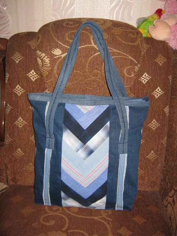 | Сумка в дорогу ( не в смысле дорожная, а в дорогу для вещей. которые должны быть близко). Материалы- джинсовая ткань различных оттенков и мужские рубашки.