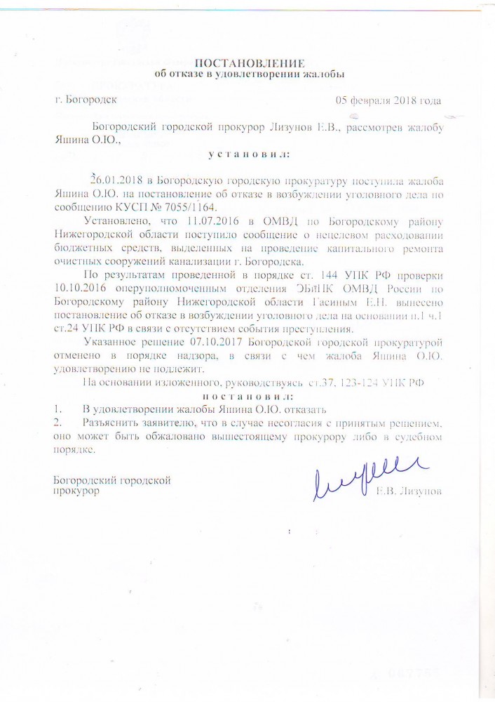 Я, Яшин Олег Юрьевич, город Богородск Нижегородская область. Несогласен с ответом Богородского городского прокурора в приложенном файле. Мне так и не разъяснили будет ли полиция города Богородска возбуждать уголовное дело, согласно материалам поступившие из Нижегородской межрайонной природоохранной прокуратуры, о нецелевом использования выделеных денежных средств на капитальный ремонт Богородских городских очистных сооружений. Прошу Вас принять меры для возбуждения уголовного дела.