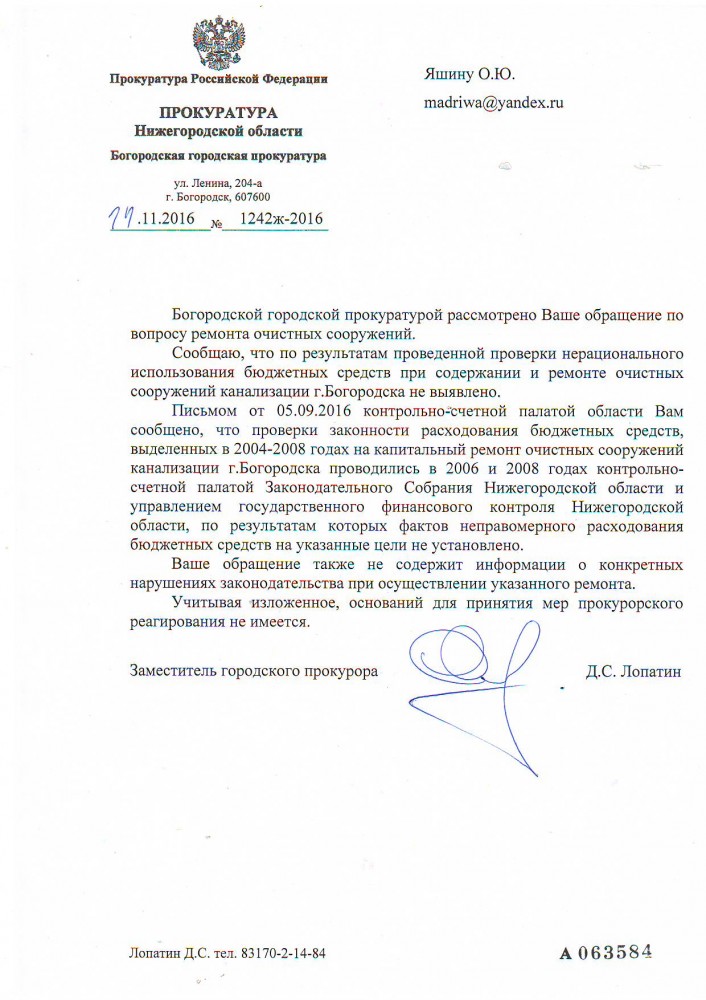 Доброе утро всем. Несогласен с ответом Богородского городского прокурора. Направил обращение в прокуратуру Нижегородской области: Я, Яшин Олег Юрьевич, город Богородск Нижегородская область несогласен с ответом Богородского городского прокурора. А именно ответ по существу обращения о нарушении тарифного законодательства в городе Богородске Нижегородской области. Я считаю, что данный закон был нарушен. Конкретный ответ я так и не получил: был нарушен или нет. Тарифы на холодную воду и водоотведения у нас в городе Богородске в два раза выше, чем в Нижнем Новгороде. ООО "Транзит " сбрасывает сточные воды с нарушением предельно допустимых норм в несколько раз в р. Рязанку и без разрешения. Считаю, что тарифы у нас в городе Богородске необоснованы.