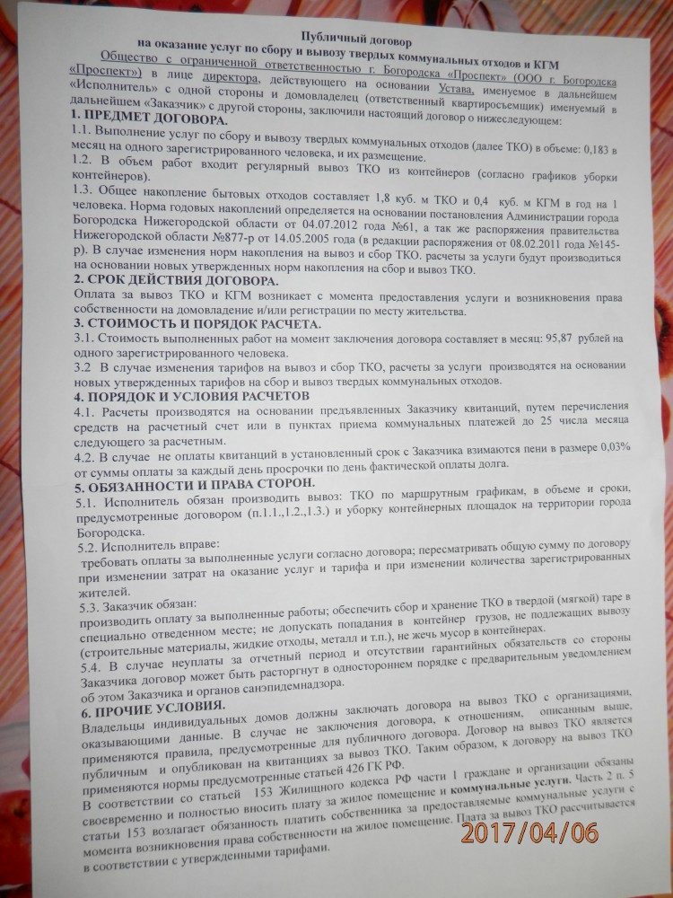 Я, Яшин Олег Юрьевич сообщаю Вам, что 06.04.2017 года собственники многоквартирного дома...................................город Богородск получили на оборотной стороне документа на оплату жилищно-коммунальных услуг за март 2017 года публичный договор ( в приложенном файле ), на оказание услуг по сбору и вывозу твёрдых коммунальных отходов и КГМ. Считаю, что данный договор направлен нам и составлен с нарушением законодательства РФ. А именно, отсутствует юридический адрес организации и фамилия директора организации ООО г. Богородск "Проспект", в результате чего я не уверен, что этот договор направлен именно от данной организации. А также отсутствие в договоре юридического адреса данной организации лишает права собственников направить протокол разногласий к проекту договора. Прошу Вас провести прокурорскую проверку согласно законодательства РФ и обязать направить проект договора председателю дома, чтобы мы собственники могли обсудить его на собрание, заключить или направить протокол разногласий к проекту договора. Ответ прошу дать за подписью прокурора города Богородска. ----------