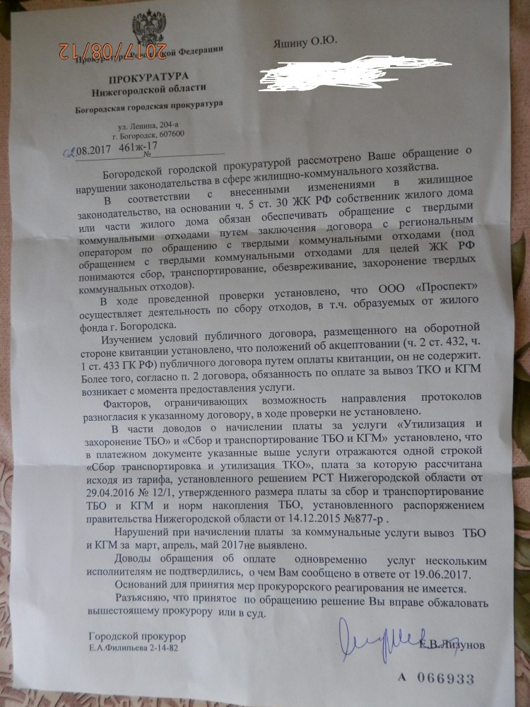 Обращение: Я, Яшин Олег Юрьевич, не согласен с ответом городского прокурора города Богородска от 02.08.2017 №461ж-17. Это бездействие к нарушению ООО г. Богородск " Проспект" и к нарушению прав собственников помещений многоквартирных домов города Богородска. 1.Прошу Вас провести прокурорскую проверку и принять меры согласно законодательству РФ к ООО г. Богородск " Проспект", а именно проверить расчёт платы по сбору и вывозу ТКО и КГМ за март, апрель, май, июнь, июль 2017 года. Согласно публичного договора, который был напечатан на оборотной стороне квитанции за коммунальные услуги, за март 2017 года., оплата по сбору и вывозу ТКО и КГМ составляет 95,87 руб. на одного зарегистрированного человека в месяц. Но согласно ответа Богородской городской прокуратуры от 31.08.2016 года №797ж-2016 заместителя городского прокурора Лопатина Д.С. в расчёт суммы 95,88 руб. входит также утилизация и захоронение твёрдых бытовых отходов. В публичном договоре от ООО г. Богородск " Проспект" мы платим только за сбор и вывоз ТКО и КГМ, сумму 95,87 руб. на одного зарегистрированного человека. На каком основании собственники помещений многоквартирных домов города Богородска обязаны платить за утилизация и захоронение твёрдых бытовых отходов в ООО г. Богородск " Проспект", если данную услугу согласно публичного договора данная организация не оказывает. Это факт коррупции, сумма завышена в несколько раз. Сумма меньше не стала, хотя услуга утилизация и захоронение твёрдых бытовых отходов в публичном договоре отсутствует. 2. Прошу Вас провести прокурорскую проверку и принять меры согласно законодательству РФ к ООО г. Богородск " Проспект", а именно, как я собственник квартиры, а также другие собственники могли направить протокол разногласий к договору на оплату услуги по сбору и вывозу ТКО и КГМ, по мнению данной прокуратуры, если в квитанции в одном лицевом счёте и штрих коде указаны две разные организации: ООО г. Богородск " Проспект" и АО "НОКК". Мы вынуждены были заплатить сразу коммунальные услуги двум организациям, а значит договор заключён к ООО г. Богородск " Проспект", так как он был указан на оборотной стороне квитанции за март 2017 года. Согласно ст.434 и ч.3 ст.438 ГК РФ. Этим ООО г. Богородск " Проспект" вынуждает нас заключить договор без направления протокола разногласий к договору. ----------