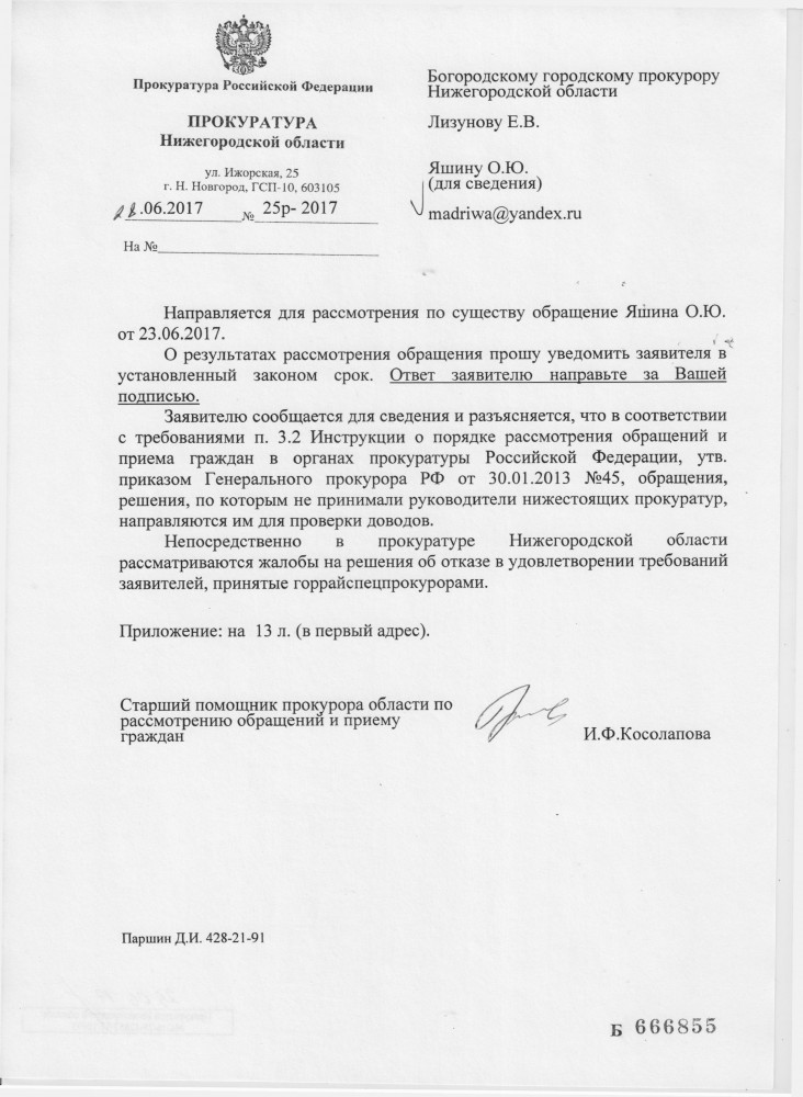 Добрый вечер всем ! Борьба продолжается !!! Ответ по существу от заместителей прокурора города Богородска и от Государственной жилищной инспекции Нижегородской области, Дзержинского отдела я так и не получил. Направил обращение с жалобой в Прокуратуру Нижегородской области, они перенаправили обратно в Богородскую городскую прокуратуру. Буду ждать ответа по существу за подписью прокурора города Богородска.