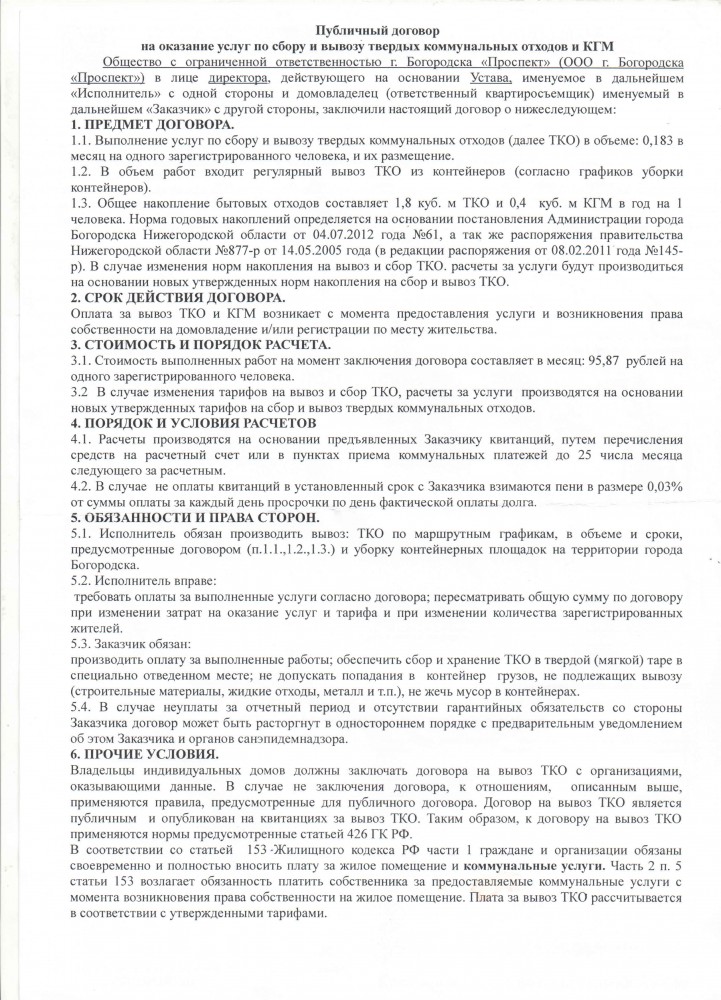 Что Вам непонятно ?! Объясняю. Согласно публичного договора от ООО г. Богородск " Проспект" данная организация нам оказывает услугу сбор и вывоз ТКО и КГМ и сумма составляет 95,87 руб. на одного зарегистрированного человека. Но в эту сумму входит также утилизация и захоронение твёрдых бытовых отходов, согласно ответу прокуратуры. Но данная организация эту услугу не оказывает, а деньги включила в эту сумму. Сейчас понятно ?! Я считаю, что в этой коррупционной схеме замешена: Администрация города Богородска, ООО "ОРБ Нижний", ООО г. Богородск " Проспект".