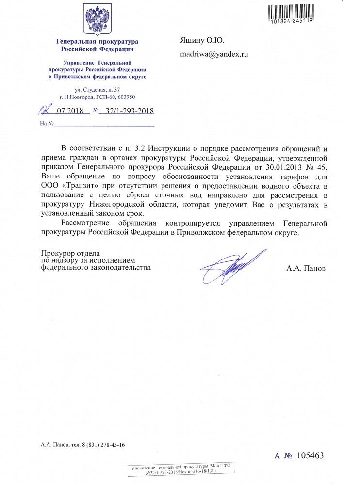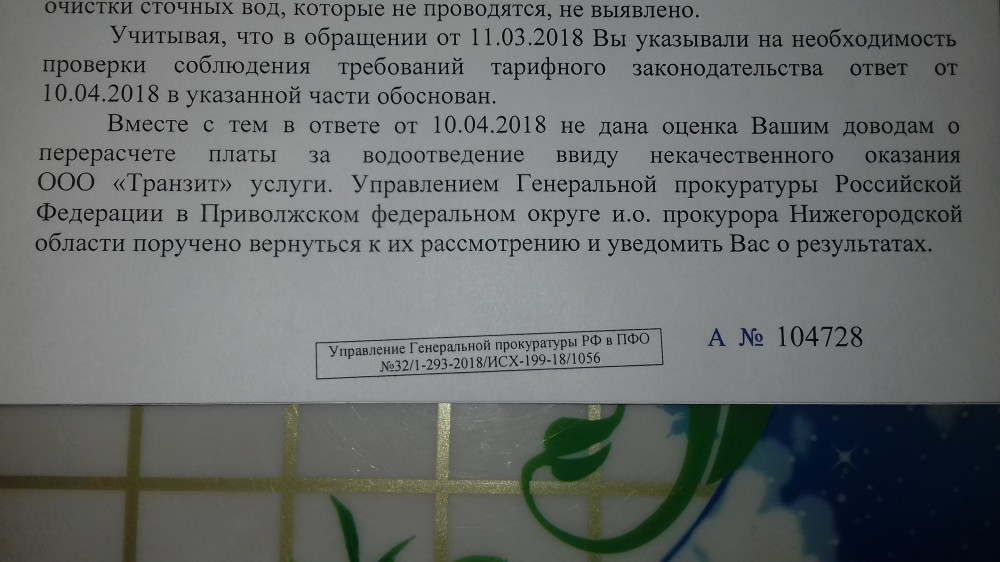 Stanislav написал: Богородские дорожные сплетни написал:Цитата:на каком основании был установлен тариф на водоотведение для ООО Транзит если у данной организации отсутствует решение об предоставлении водного объекта р. Рязанка для сброса сточных вод. Это законно ?А что природоохранная прокуратура по этому поводу "говорит"? Подробнее. Вот направил обращение в прокуратуру посмотрим, что ответят. ----------
