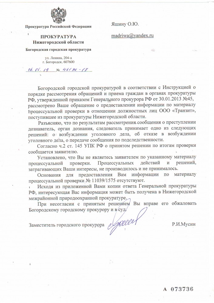 Добрый вечер всем. Жители города Богородска и района прокуратура города Богородска считает, что я незаявитель. А кто же я ??? и кто требует от природоохранной прокуратуры чтобы они принимали меры для возбуждения уголовного дела. Да это я, Яшин Олег Юрьевич. Также каждый житель города Богородска и района имеет право на предоставление достоверной информации, когда наши права нарушаются согласно статьи 42 Конституции РФ. И прошу Вас жителей города Богородска и района также это делать, как я. Я считаю это бездействия полиции и прокуратуры города Богородска и района !!! Я считаю это сговор !!!