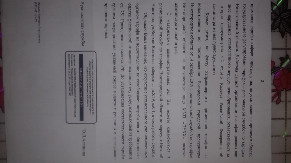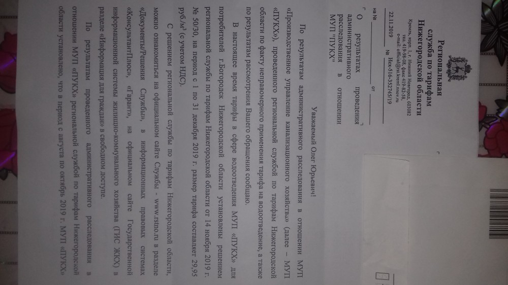 Добрый вечер всем. Вот наконец и установили законно тариф на коммунальную услугу водоотведение для жителей города Богородска Нижегородской области. С ноября он стал 29,95 руб. за куб.м. С августа по октябрь 2019 года организация МУП "ПУКХ" незаконно направляла квитанции жителям города Богородска с этим тарифом, у неё небыло законных прав это делать. Моя личная позиция по этому поводу: платить за коммунальную услугу водоотведение начинаю с ноября этого года, когда был законно установлен тариф. А за те месяца платить отказываюсь так как квитанции направляли с этим тарифом незаконно. Учредителем данной организации согласно Единого государственного реестра юридического лица является Администрация Богородского муниципального района Нижегородской области, она её создала и ответственная за её незаконные действия, вот пусть и оплачивает. Если несогласны, пусть МУП "ПУКХ" направляет на меня исковое заявление в суд. Меня интересует ещё один вопрос, но это к Региональной службе по тарифам Нижегородской области: учитывали они тот факт при установки тарифа на коммунальную услугу водоотведение, что у данной организации отсутствует разрешение использовать водный объект р. Рязанка для сброса сточных вод. Это означает, что фактически очистки сточных вод нет. А согласно законодательства РФ водоотведение это приём, транспортировка и очистка сточных вод.