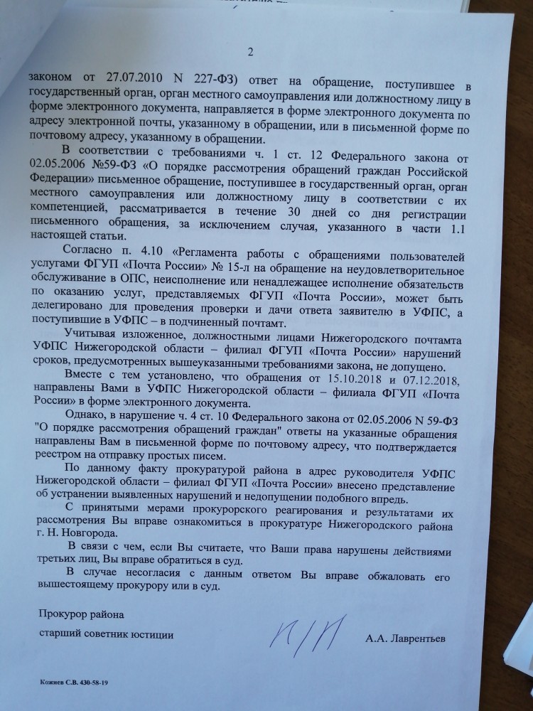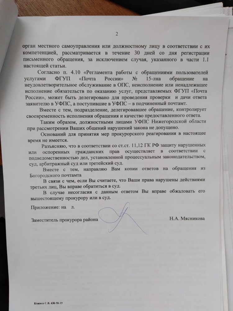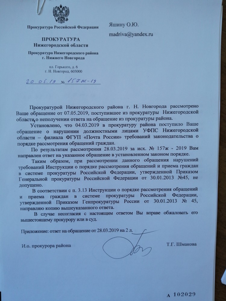 Я, Яшин Олег Юрьевич город Богородск Нижегородская область. Несогласен с ответом прокурора района ( ответ в приложенном файле). А именно ответ мне дан не по существу моего обращения. Я сообщал на почту России по Нижегородской области, что я не получил ответ на мою жалобу от Богородского почтамта, которую они направляли туда и просил их срочно принять меры, но мер для предоставления мне ответа по существу моего обращения принято небыло. Данное обращение было опять направлено в Богодский почтамт, ответа я так и не получил. Считал это бездействие и факт волокиты почты России по Нижегородской области, как вышестоящей организации и просил прокуратуру провести прокурорскую проверку и принять меры согласно законодательству РФ. А именно самим провести проверку моего обращения от 13.10.2018 года направленое на почту России, на электронную почту office-r52@russianpost.ru. Копия данного обращения: Сегодня 13.10.2018 года на почте 607603 оплачивал квитанции налог на имущество в количестве 4 шт. С меня взяли за каждую квитанцию Сбор за ИТО-40 руб. и ООО Европейская юридическая служба-45 руб. За что с меня взяли за консультацию по налогооблажению, получатель ООО Европейская юридическая служба, на почте ? Я к ним не обращался ! Это законно ? Квитанции в приложенном файле. Но прокурорской проверке по существу моего обращения небыло. Следовательно прошу прокуратуру города Н.Новгорода провести прокурорскую проверку по существу моего обращения. Также сообщаю Вам, что по настоящее время ответ по существу моего обращения на мои жалобы от почты России по Нижегородской области и от Богородского почтамта я не получил, а также копии ответов на мои жалобы от Богородского почтамта от заместителя прокурора района Мясниковой Н.А., которые должны были направить мне согласно её ответа от 15.02.2019 номер 157ж -2019. Копию ответа от прокурора района Лаврентьева А.А. я получил на свою электронную почту 24.05.2019 года после того, как я обратился в прокуратуру Нижегородской области с жалобой о не получения ответа за подписью прокурора района. До этого времени я ответ от 28.03.2019 номер 157ж-2019 не получал. Считаю это факт волокиты и бездействия прокуратуры Нижегородского района, города Нижнего Новгорода. ----------