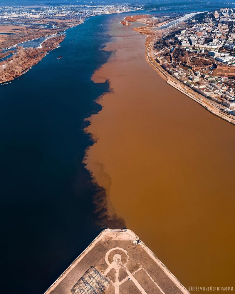 Вот и причина плохого водоснабжения в Богородске. Фотография с Instagram пользователя dukhnik_nikita 12 апреля 2021 года, слияние Оки и Волги на стрелке. https://www.instagram.com/p/CNr0ltVpofy/?utm_source=ig_embed