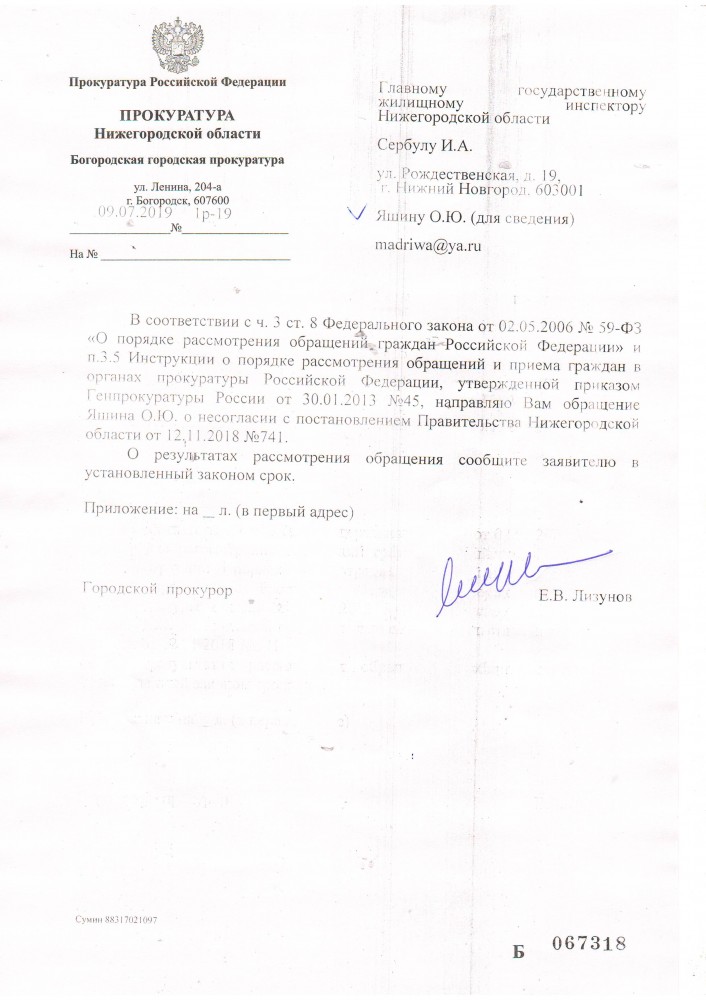 Направил обращение опять в прокуратуру Нижегородской области: Я, Яшин Олег Юрьевич город Богородск Нижегородская область требую Вас провести прокурорскую проверку по моиму обращению, так как прокуратура города Богородска отказалась это делать. Копия моего обращения: Я, Яшин Олег Юрьевич город Богородск Нижегородская область. Согласно ПРАВИТЕЛЬСТВО НИЖЕГОРОДСКОЙ ОБЛАСТИ ПОСТАНОВЛЕНИЕ от 12 ноября 2018 г № 741 Об утверждении нормативов потребления коммунальной услуги по отоплению на территории Богородского муниципального района Нижегородской области были утверждены новые нормативы потребления коммунальной услуги по отоплению на территории Богородского муниципального района Нижегородской области, которые оказались больше. А также данное постановление распространяется на правоотношения, возникшие с 16 ноября 2017 г. Считаю это необоснованно и незаконно повышения норматива на отопления. Прошу Вас провести прокурорскую проверку данного постановления. Ответы в приложенном файле. ----------