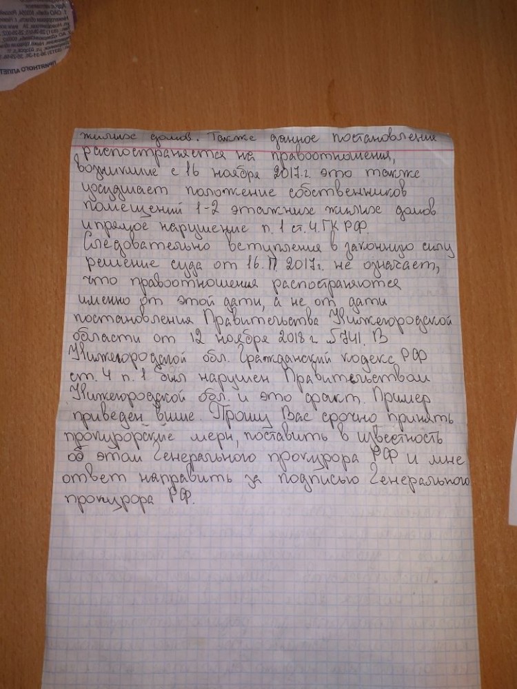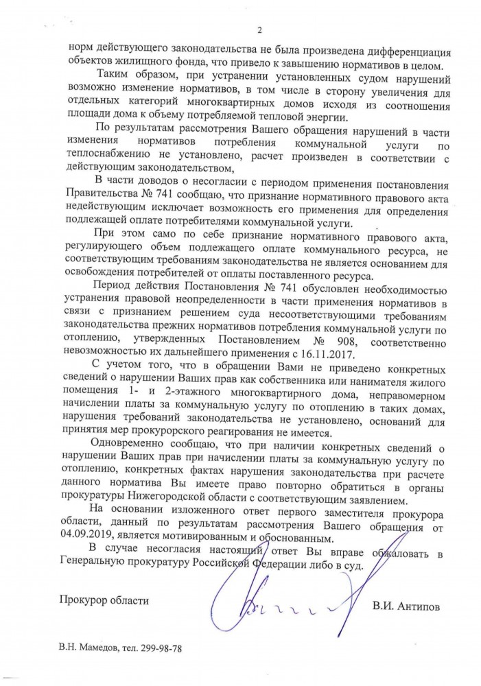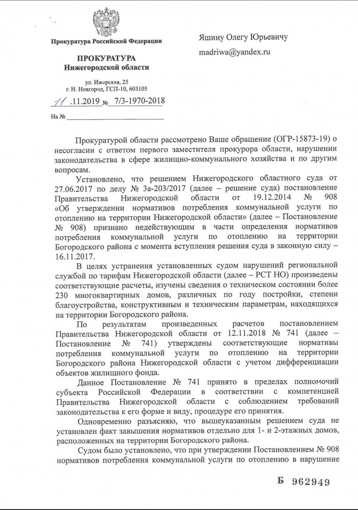 Я, Яшин Олег Юрьевич город Богородск Нижегородская область несогласен с ответом прокурора Нижегородской области (ответ в приложенном файле). Согласно постановления Правительство Нижегородской области от 12 ноября 2018 г № 741 Об утверждении нормативов потребления коммунальной услуги по отоплению на территории Богородского муниципального района Нижегородской области были утверждены новые нормативы потребления коммунальной услуги по отоплению на территории Богородского муниципального района Нижегородской области, которые оказались больше для собственников помещений 1-2 этажных жилых домов. Считаю это необоснованно и незаконно повышения норматива на отопления для собственников помещений 1-2 этажных жилых домов так как судом установлено, что старые нормативы были завышены для разных категорий жилых домов, а значит повышать их постановлением Правительства Нижегородской области от 12 ноября 2018 г № 741 не имели право, только понизить для разных категорий жилых домов. Установить новые нормативы на отопления нужно было так, чтобы они не ухудшили положения собственников помещений жилых домов всех категорий, а не отдельных что не произошло для собственников помещений 1-2 этажных жилых домов. Также данное постановление распространяется на правоотношения, возникшие с 16 ноября 2017 г. это также ухудшает положение собственников помещений 1-2 этажных жилых домов и прямое нарушение п.1 ст.4 ГК РФ. Следовательно вступления в законную силу решения суда от 16.11.2017 года не означает, что правоотношения распространяются именно от этой даты, а не от даты постановления Правительства Нижегородской области от 12 ноября 2018 г № 741. В Нижегородской области Гражданский кодекс РФ ст.4 п.1 был нарушен Правительством Нижегородской области и это факт. Пример приведён ввыше. Прошу Вас срочно принять прокурорские меры, поставить в известность об этом Генерального прокурора РФ и ответ мне направить за подписью Генерального прокурора РФ. ----------