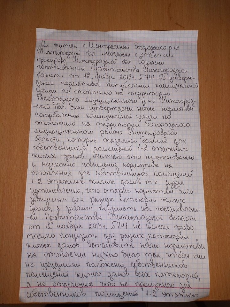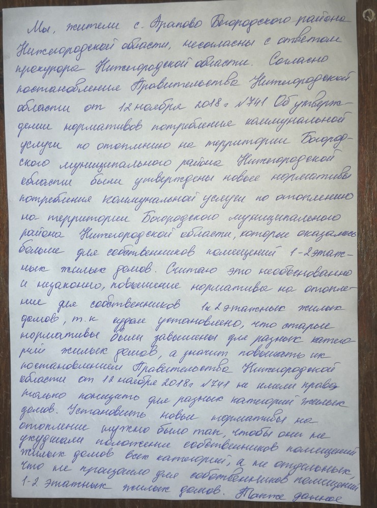 Добрый вечер всем. Жители села Арапово Богородского района Нижегородской области также несогласны с ответом прокурора Нижегородской области. Это на счёт повышения норматива на отопления. Жители города Богородска и района Нижегородской области нужна массовая огласка это беспредела !!! Моё обращение о несогласии с ответом прокурора Нижегородской области и дополнение к нему от жителей посёлка Центральный Богородского района Нижегородской области находятся в Генеральной прокуратуре РФ. Буду также направлять и обращение жителей с. Арапово, как дополнение к моему обращению. Кто ещё несогласен с повышением норматива на отопления в городе Богородске и районе