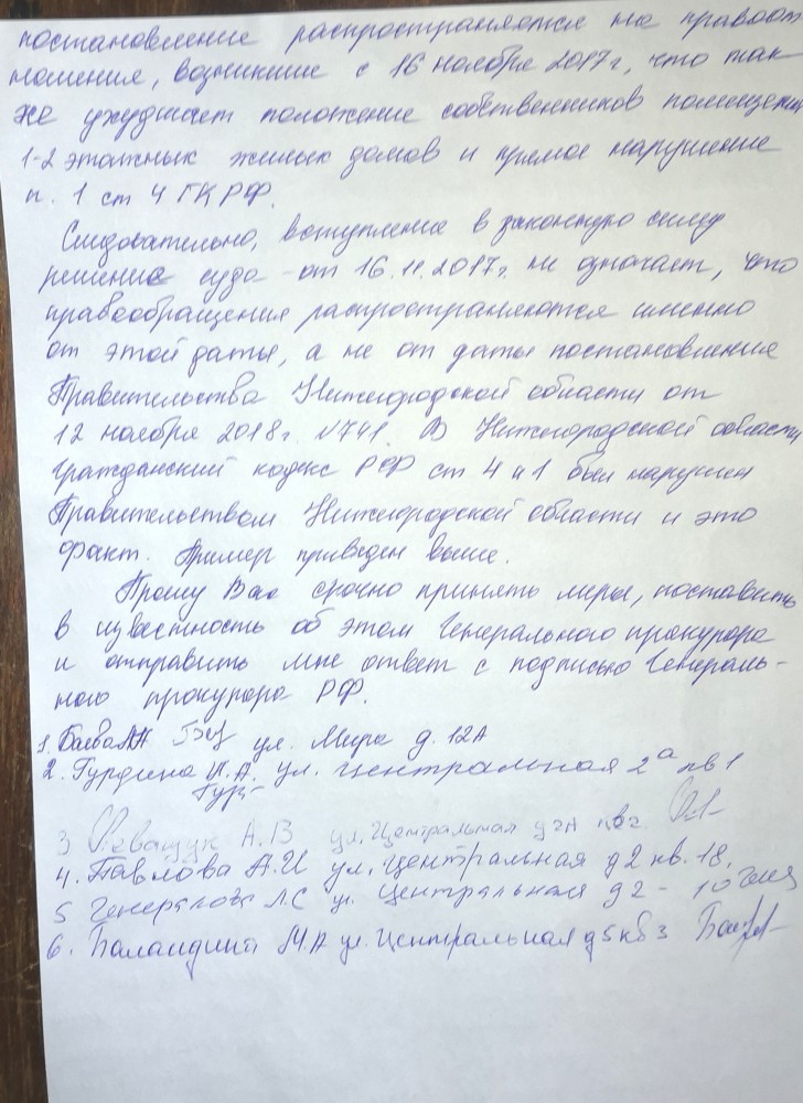 Жители города Богородска и района Нижегородской области, а именно собственники помещений, которые живут в 1-2 этажных жилых домах. Сообщаю Вам, что моё обращение я направил в Генеральную прокуратуру РФ о несогласии с ответом прокурора Нижегородской области. Это на счёт повышения норматива на отопления собственникам помещений в 1-2 этажных жилых домах. Моё обращение наверно перенаправят в Генеральную прокуратуру РФ в Приволжском федеральном округе. Я лично сам живу в 5-и этажном жилом доме и меня это не коснулось, но возмутил этот беспредел который произошёл с ними. Жители посёлка Центральный Богородский район Нижегородская область собрали подписи и направили мне обращение на электронную почту madriwa@yandex.ru. Если кто также не согласен с беспределом в городе Богородске и районе Нижегородской области пишите коллективные обращения: адрес, фамилия и подпись. И также как и жители посёлка Центральный направляйте мне на электронную почту madriwa@yandex.ru. А также я обращаюсь к собственникам помещений, которые не живут в 1-2 этажных жилых домах, давайте поможем им, хотя-бы массовой оглаской !!! Вместе мы сила !!! Формулировка обращения в приложенном файле. ----------