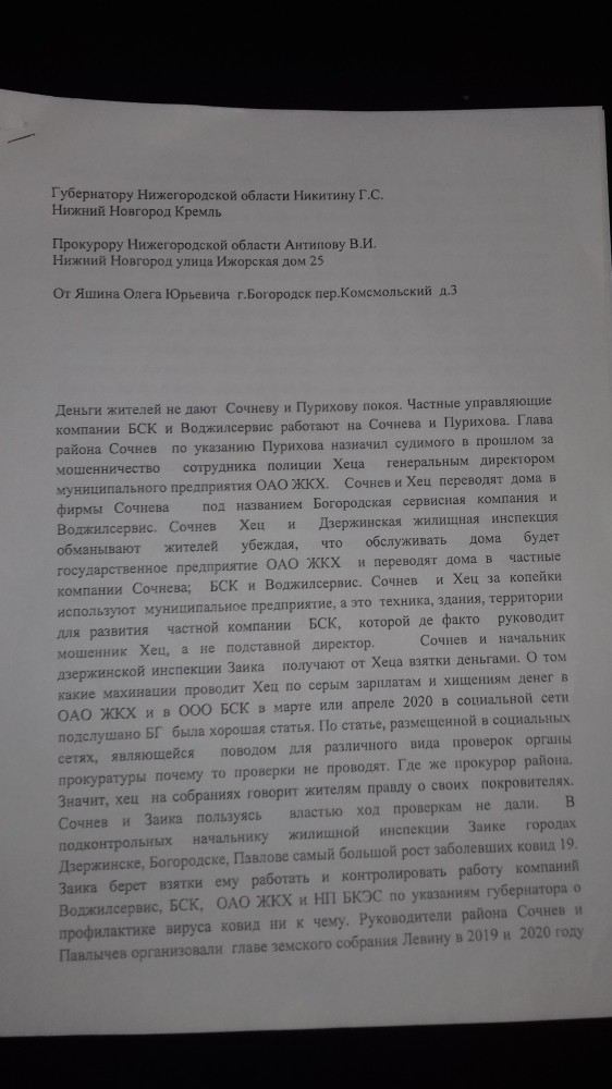 Я, Яшин Олег Юрьевич город Богородск Нижегородская область официально сообщаю государственным органам власти, что от моего имени пишут Вам обращения и подделывают мою подпись или просто ставят закорючку и обращение как бы от меня !!! Например направили в правительство Нижегородской области, которое было перенаправлено в департамент региональной безопасности Нижегородской области. Узнал случайно. Пришлось ехать туда с паспортом и писать заявление что я "не верблюд". Звонили из жилищной инспекции и сказали, что сразу поняли что писал не я. Также от моего имени направили обращения в прокуратуру и в полицию.