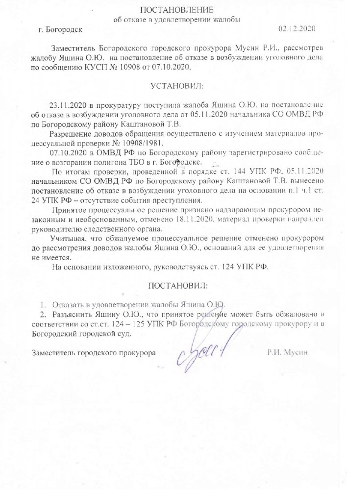 Добрый вечер всем. Вот так примерно у нас работает Богородский межрайонный следственный отдел: Ну горела свалка, ну был весь город в дыму, ну дышали жители этой гарью и что из этого ???!!! Преступления в этом нет, а?! пусть там полиция разберается в этом !!!