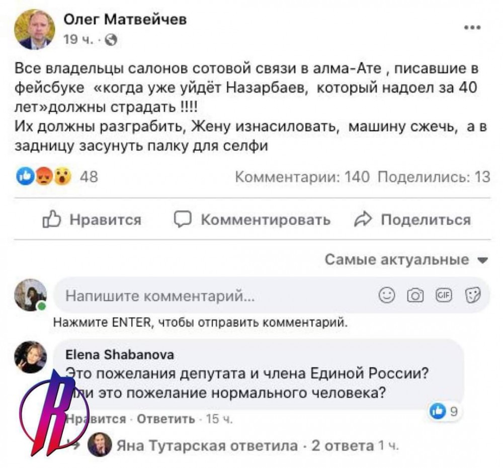 Stanislav написал: Богородские дорожные сплетни написал:Цитата:Лично я против !!!Не путайте разные происходящие там явления—режим власти,всем там надоевший и бандитские погромы в городах,осуществляемые при помощи проплаченного малограмотного населения аулов и мелких городков. А как Вам это: Российские власти ведут боевые действия, спасая режим Назарбаева, не только в Казахстане, но и в соцсетях. Так, депутат Госдумы Олег Матвейчев написал в своем Facebook: «Все владельцы салонов сотовой связи в Алма-Ате, писавшие в фейсбуке «когда уже уйдёт Назарбаев, который надоел за 40 лет» должны страдать!!!! Их должны разграбить, жену изнасиловать, машину сжечь, а в задницу засунуть палку для селфи». ----------