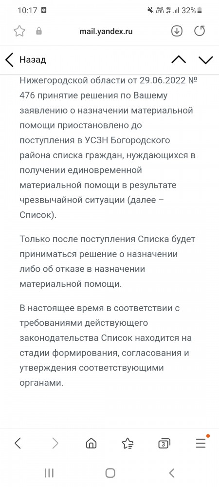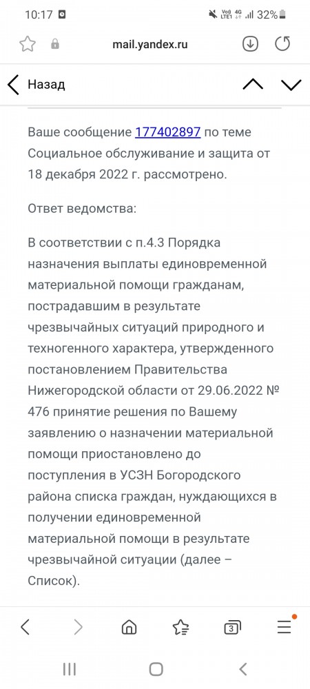 Ваше обращение по вопросу предоставления жителям Богородского муниципального округа денежных выплат в результате возникновения чрезвычайной ситуации с 23 по 25 ноября 2022 года рассмотрено. В соответствии с Порядком создания и использования резерва финансовых ресурсов для ликвидации чрезвычайных ситуаций межмуниципального и регионального характера на территории Нижегородской области, утвержденным постановлением Правительства Нижегородской области от 29 июня 2022 г. № 476 главным распорядителем бюджетных ассигнований целевого финансового резерва в части предоставления денежных выплат гражданам является министерство социальной политики Нижегородской области. В соответствии с частью 3 статьи 8 Федерального закона от 2 мая 2006 г. № 59-ФЗ "О порядке рассмотрения обращений граждан Российской Федерации" Ваше обращение для рассмотрения и направления ответа по существу направлено в министерство социальной политики Нижегородской области. ----------