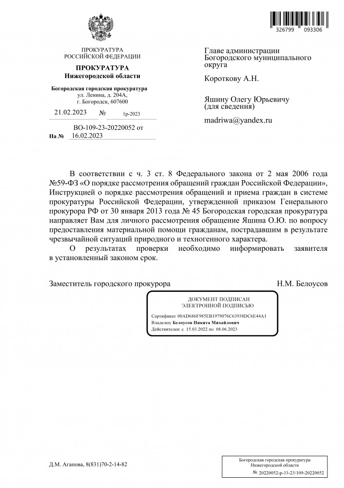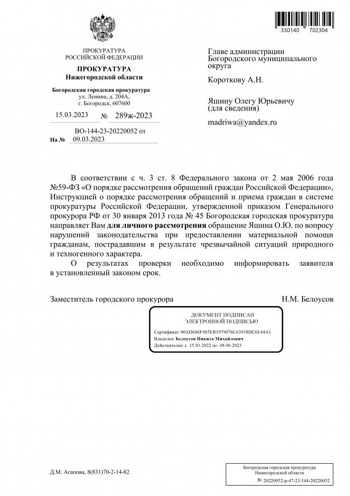 Зимин Михаил Геннадьевич примите лично меры, а то это уже бездействие прокуратуры города Богородска. Я просил прокуратуру провести прокурорскую проверку администрации Богородского муниципального округа Нижегородской области на факт о непредставлений сведений о пострадавших жителей в результате чрезвычайной ситуации в ноябре 2022 года в городе Богородске и принять прокурорские меры. Данное обращение было перенаправлено заместителем тому, кто нарушил законодательства Российской Федерации. Это уже второй раз !!!