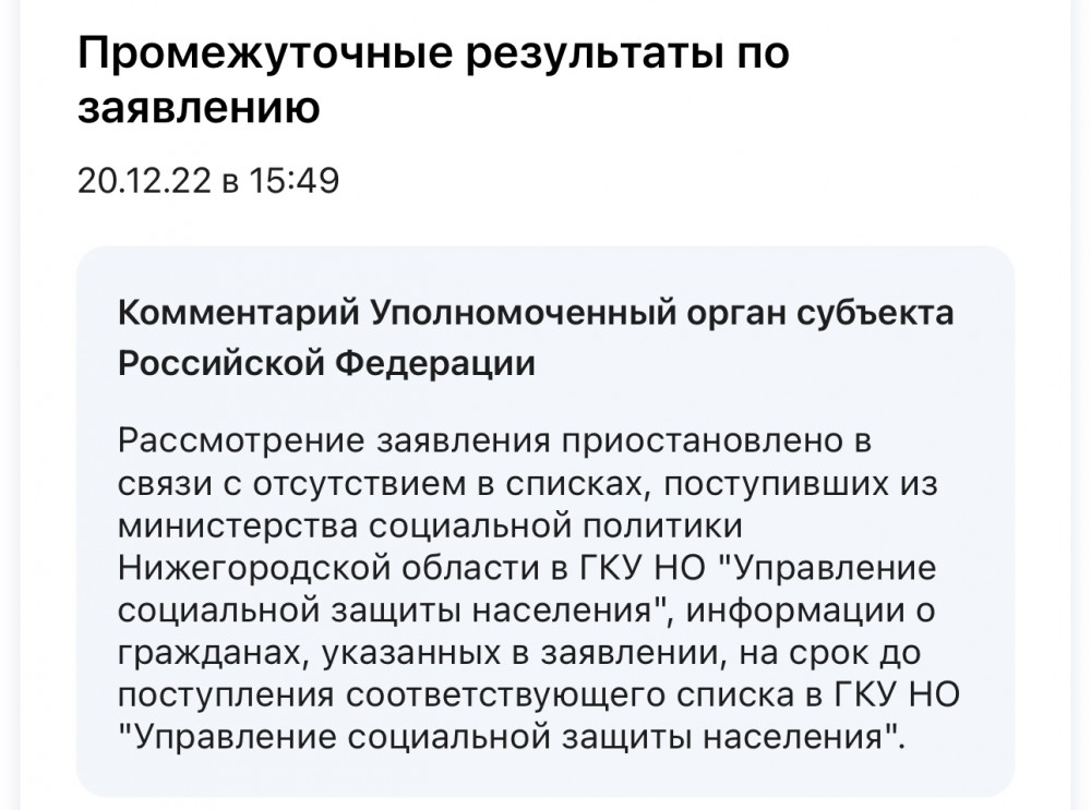 | Ну поздравляю, а мы так и на рассмотрении, прокуратура направила наше обращение в администрацию, срок предоставления ответа в регламентированные сроки, на почте нас тоже нет в списке. А вот скажите, в госуслугах у вас что указано? Точней какой статус заяаления