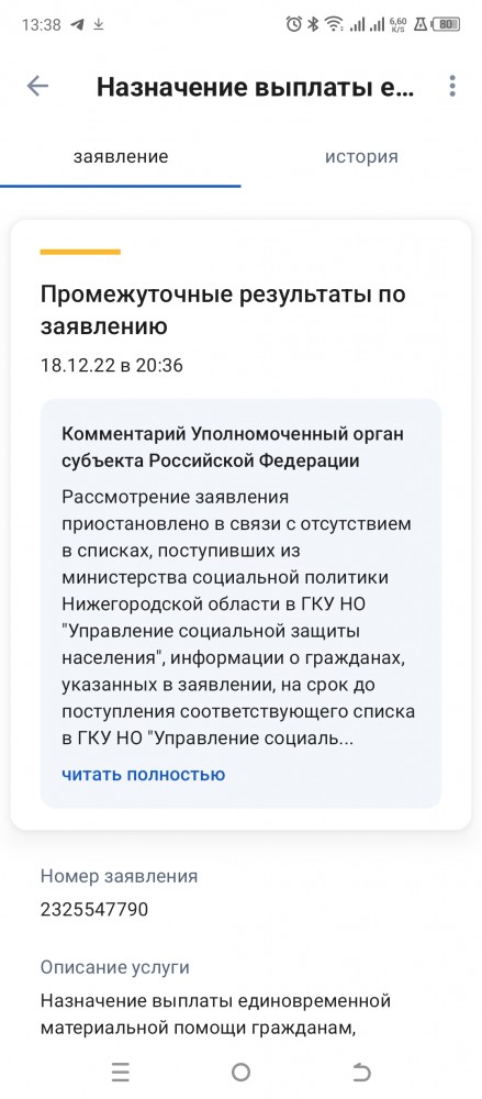 | Kazylika написал: Ну поздравляю, а мы так и на рассмотрении, прокуратура направила наше обращение в администрацию, срок предоставления ответа в регламентированные сроки, на почте нас тоже нет в списке. А вот скажите, в госуслугах у вас что указано? Точней какой статус заяаления Вот что было последнее: |