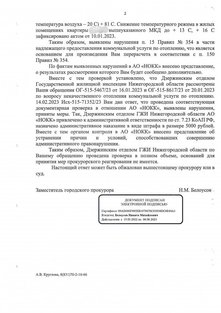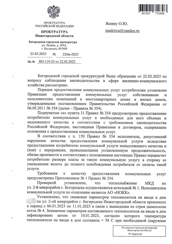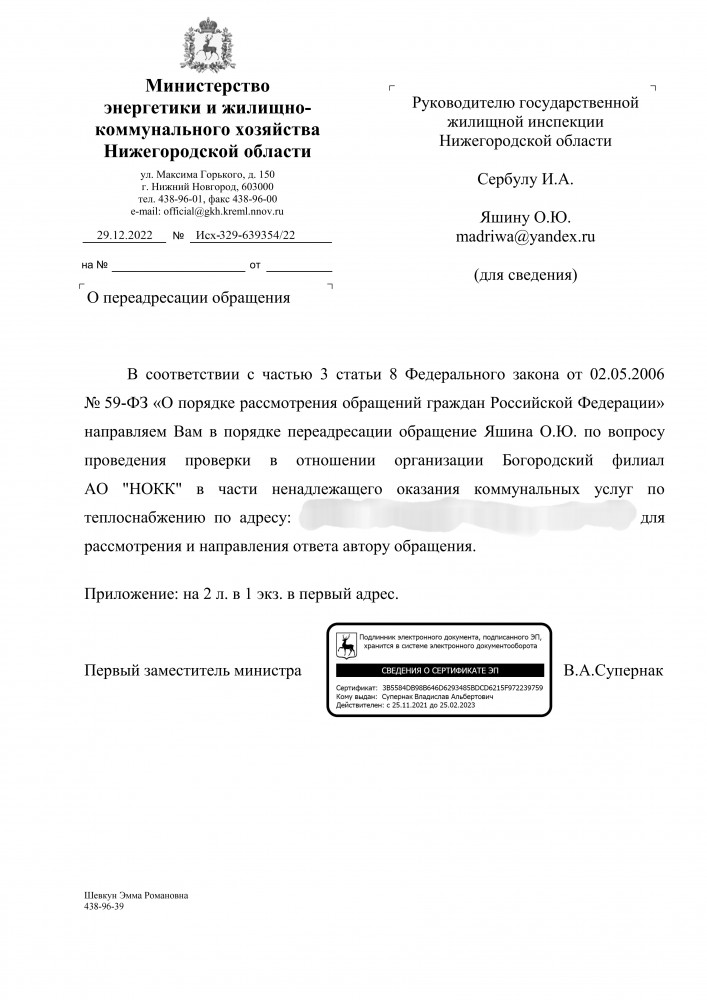 Направил в Министерство энергетики и жилищно-коммунального хозяйства Нижегородской области на электронную почту: vopros-otvet@gkh.kreml.nnov.ru Жители города Богородска если согласны со мной то пишите и нужна массовая огласка !!! Я, Яшин Олег Юрьевич, город Богородск Нижегородская область, ................. Прошу Вас провести проверку организации Богородский филиал АО "НОКК". Из за отсутствие энергоснабжения в городе Богородске с 23 ноября по 25 ноября 2022 года данная организация не предоставляла услугу отопление. Почему в данной организации отсутствует генератор, устройство вырабатывающее электроэнергию ??? Также с вечера 23 декабря 2022 года до раннего утра 24 декабря 2022 года также отсутствовала услуга отопление. Из-за отсутствие услуги отопления стены квартиры холодные и чернеют. Нам жителям приходиться включать электрообогреватели. Мы платим за отопление каждый месяц даже если его нет и плюс ещё за электроэнергию, чтобы обогреть квартиру, когда услуга отопление зимой отсутствует. Отапливают МКД очень плохо !!! Прошу принять срочно меры к этой организации и поставить в известность губернатора Нижегородской области о ситуации в городе Богородске. Копия паспорта в приложенном файле. Ответ прошу Вас направить на мою электронную почту. ----------