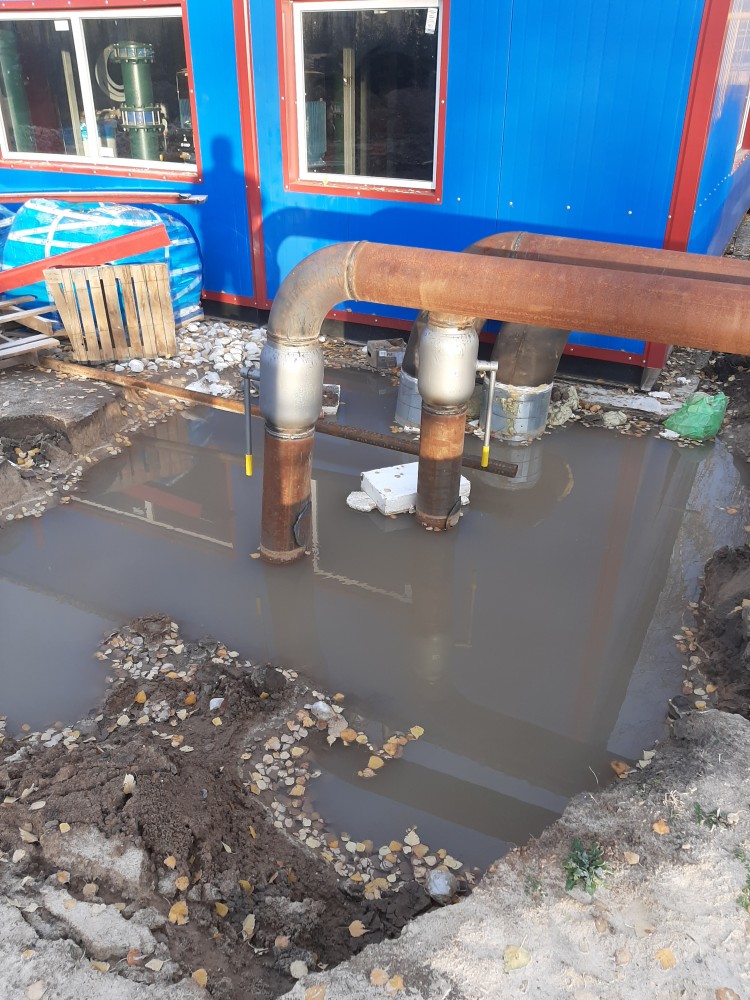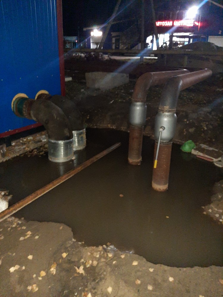 Город Богородск на улице минус 3 градуса. Труба по которой идёт горячая вода для отопления 1-го микрорайона в воде. Вода тёплая.