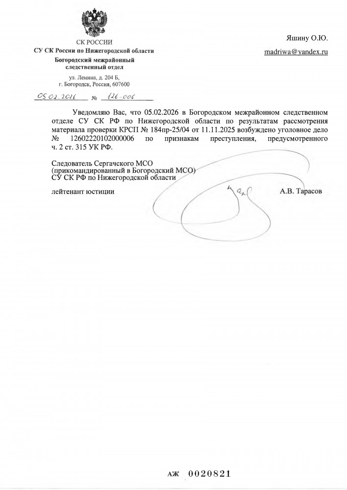 Богородский межрайонный следственный отдел возбудил второй раз уголовное дело по ч. 2 ст. 315 УК РФ это неисполнения решения Богородского городского суда Нижегородской области. Первое уголовное дело прокуратура отменила. https://vk.ru/wall349781177_3233 ----------
