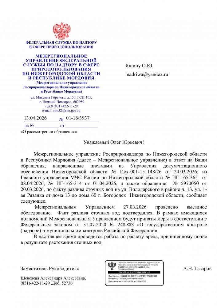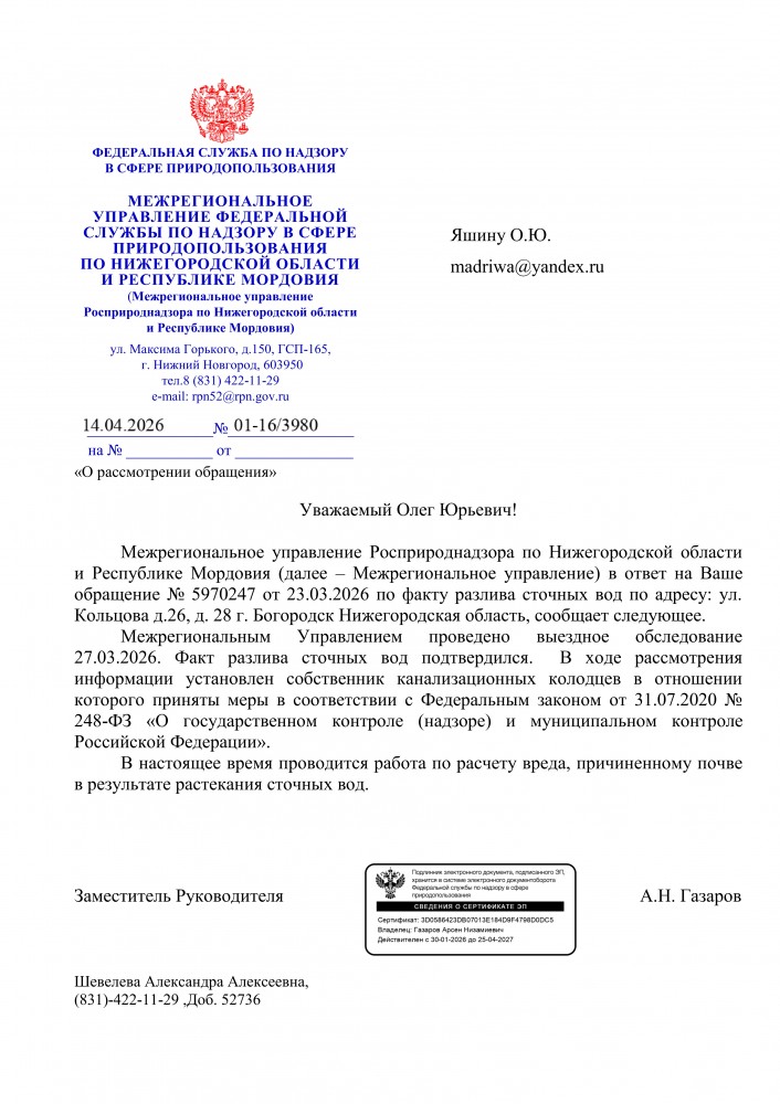 Согласно ответа: Администрация Богородского муниципального округа Нижегородской области указывала администрации МУП «УВКХ» на недопустимость разлива сточных вод на рельеф и о надлежащей эксплуатации вверенного оборудования. А канализационные сточные воды так и вытекают из канализационных колодцев на улице 1-я Рязанка и не только. Прикрепленный файл (Яшин О.Ю._(файл отображения) (2).pdf, 137.87 Kb, просмотрен: 10 раз) ----------
