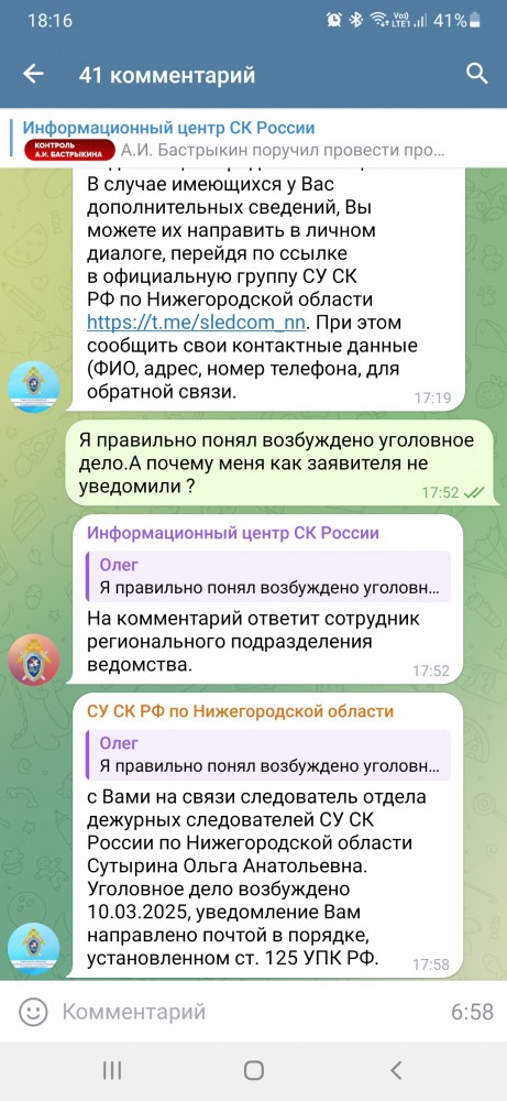 Добрый вечер всем. Сегодня мне ответили, что 10.03.2025 года по ч.1 ст.293 УК РФ возбуждено уголовное дело по факту разлива сточных вод на улице 1-я Рязанка. Спасибо Вам большое Александр Иванович Бастрыкин, что услышали жителей города Богородска, Нижегородской области.