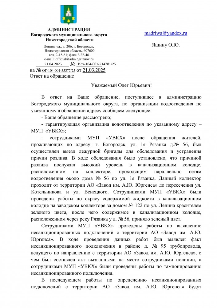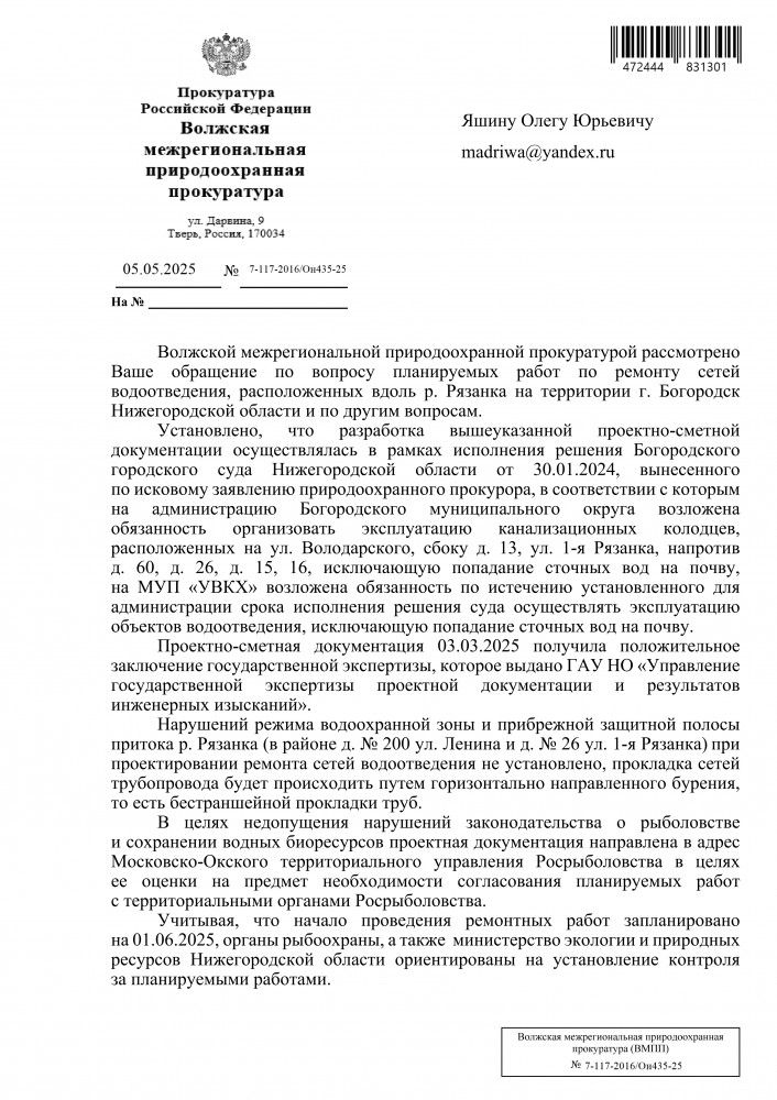 Sub-Zero написал: ...скорее всего в курсе, но создаётся впечатление, что администрация либо не воспринимает проблему всерьёз, либо не имеет чёткого плана её решения. Проект у них есть, и он как ответила прокуратура проект получил положительное заключение государственной экспертизы. В 2025 году по решению суда будут менять канализационную сеть на улице 1-я Рязанка в первую очередь. У меня остаётся открытым вопрос к прокуратуре. Они считают что нарушения нет, а я считаю что есть. Обращение: Я, Яшин Олег Юрьевич, житель города Богородск, Нижегородская область. Не согласен с ответом заместителя межрайонного природоохранного прокурора, в приложенном файле. Согласно ответа: Кроме того, сообщаю, что согласование проектно-сметной документации с территориальными органами Федерального агентства по рыболовству не требуется, поскольку ремонтные работы сетей водоотведения проводятся вне границ водоохранной зоны и прибрежной защитной полосы притока р. Рязанка. Скриншот водоохранной зоны на улице 1-я Рязанка, в приложенном файле, где я считаю будет проложен новый коллектор. Прошу прокуратуру провести проверку, а именно считаю данный проект не был согласован с территориальными органами Федерального агентства по рыболовству. А также в данном проекте небыли учтены водоохранная зона притока реки Рязанка на территории Богородского муниципального округа (в районе д. № 200 ул. Ленина и д. № 26 ул. 1-я Рязанка) Нижегородской области» с реестровым номером 52:23-6.327, дата внесения сведений 04.10.2024 и прибрежная защитная полоса притока реки Рязанка на территории Богородского муниципального округа (в районе д. № 200 ул. Ленина и д. № 26 ул. 1-я Рязанка) Нижегородской области» с реестровым номером 52:23-6.328, дата внесения сведений 04.10.2024. Ответ прошу направить на мою электронную почту, за подписью межрайонного природоохранного прокурора. Прикрепленный файл (Михайлов на счёт проекта.pdf, 285.39 Kb, просмотрен: 113 раз) ----------