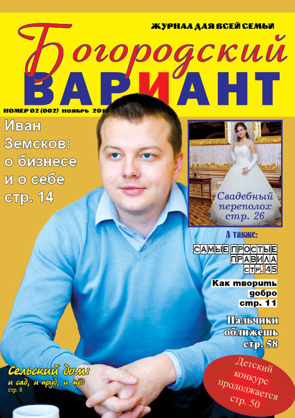 В центре внимания молодой предприниматель Иван Земсков. О его бизнесе и личной жизни можно прочитать в номере. Интересные юридические консультации для людей вступающих в брак. Читайте о проблемах Дома культуры, жизни на селе и о многом другом. Обратите внимание на рекламные блоки. Купить журнал можно в любом почтовом отделении города и района, в киосках "Печать", в магазине "Книги" и торговом центре "Вариант", в универсаме "Богородский", в торговом центре "Максим", на первом этаже администрации города, а также у наших распространителей. Цена журнала 45 рублей. Стоимость подписки: 3 номера - 120 рублей, 6 номеров - 240, 9 номеров - 360 рублей, годовая подписка - 480 рублей. Подписку можно оформить в торговом центре "Вариант". Приглашаем к сотрудничеству молодых корреспондентов, а также жителей города, которым есть что сказать о жизни города. Ваше мнение очень важно для нас. Ведь наш журнал - это издание, которое может рассказать о самом важном и главном, что волнует именно богородчан. Готовится к выпуску 3-ий номер. Желающих поучаствовать в его создании приглашаем в редакцию. Материалы можно направить и по электронной почте. |